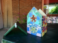 Jaren geleden heb ik een vogelhuisje gemozaïekt. Met een huisgodje op de nok ter bescherming van de toekomstige bewoners. Het huisje hangt nu zo’n anderhalf jaar buiten, maar met de verkoop ging het niet zo lekker. Aan de locatie kon het niet liggen: op de goede hoogte, uitzicht op het noorden zodat het binnen niet te warm wordt en met vrije aanvliegroute. We hadden wel wat kijkers, maar ze hapten nog niet toe. Kennelijk was de tijd nog niet rijp. Tot we begin juni een koolmees met een rups naar binnen zagen vliegen. Eindelijk bewoning! Een jong stel met kinderwens.